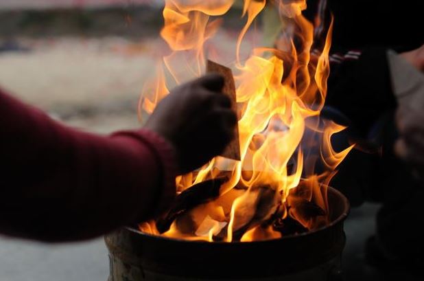 然后回到屋内,在香炉里烧纳财贵库符。再到大门烧化添财库符、化金银纸。